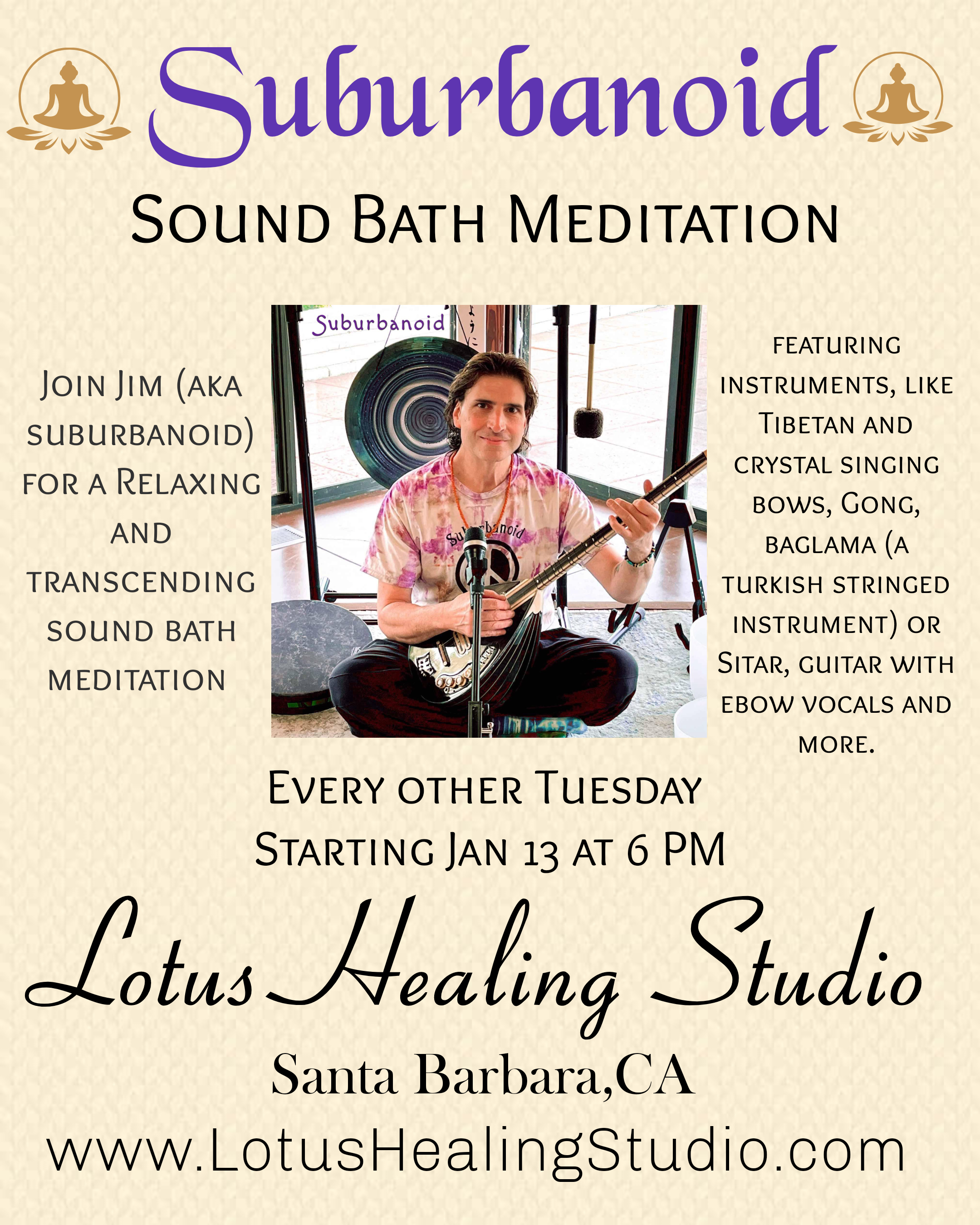 Suburbanoids peaceful sound bath meditation experience features sound drones layered with Fusion Sitar, Tibetan singing bowls, Ebow electric guitar, Crystal singing bowls, gong, synthesizer, sound loops, ocean drum, Koshi chimes and vocals.